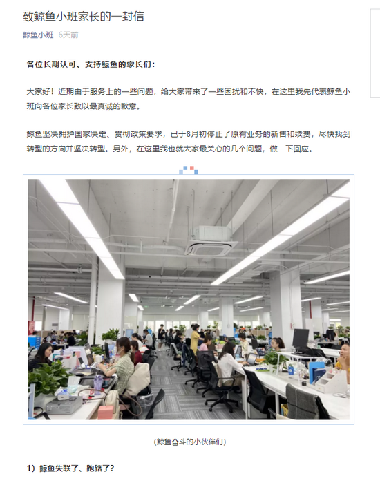 这封信中表示,7月底以来,鲸鱼的咨询量翻了几十倍,远远超出了当前服务团队的承接能力;鲸鱼人员变动导致用户联系不上原来的客服人员。导致家长微信没有及时回复、客服电话打不进来,进一步传递了不安情绪和更多家长来咨询,产生了恶性循环。