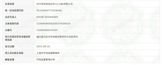 据信用中国网站信息显示,华尔街英语培训中心(上海)有限公司成立于2005年7月,法定代表人为David Kedwards。8月16日,华尔街英语因“通过登记的住所或者经营场所无法联系的”,被上海市市场监督管理局列入经营异常名录。