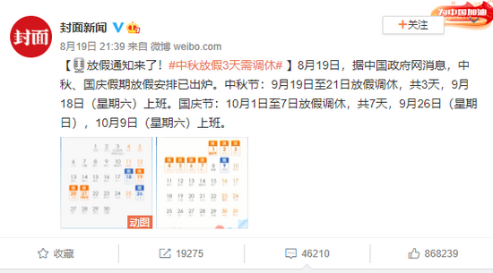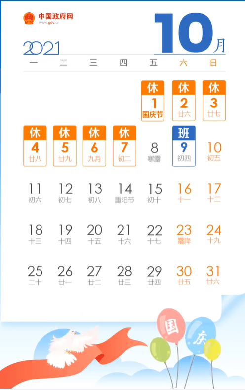 8月19日,据中国政府网消息,中秋、国庆假期放假安排已出炉。中秋节:9月19日至21日放假调休,共3天,9月18日(星期六)上班。国庆节:10月1日至7日放假调休,共7天,9月26日(星期日),10月9日(星期六)上班。