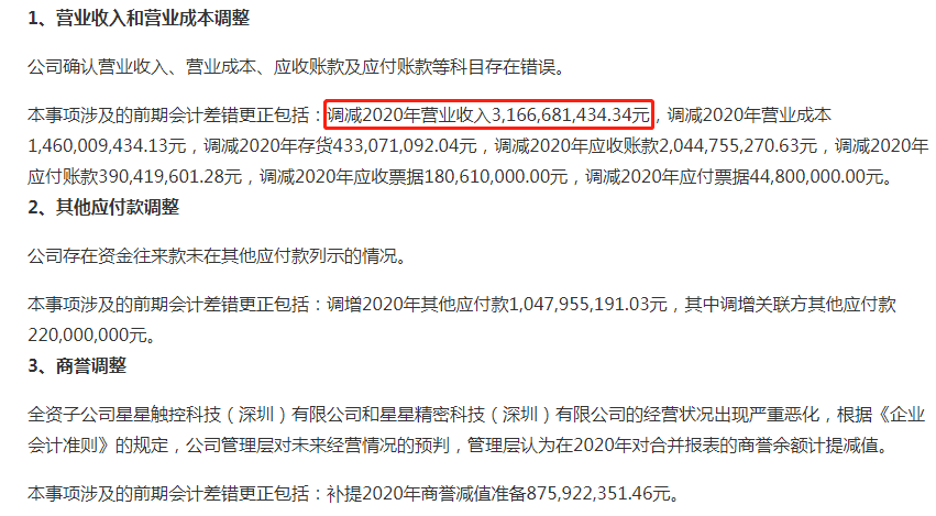 公告显示,公司确认营业收入、营业成本、应收账款及应付账款等科目存在错误;存在资金往来款未在其他应付款列示;子公司经营严重恶化但未计提商誉等情况。