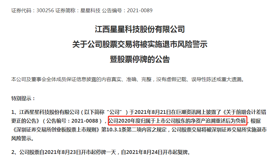 星星科技8月20日晚间公告,公司在编制2021年半年度财务报表时,发现2020年度财务报表存在会计差错,导致公司2020年度归属于上市公司股东的净资产追溯重述后为负值,根据《深圳证券交易所创业板股票上市规则》第10.3.1条第二项内容之规定,公司股票交易将被深圳证券交易所实施退市风险警示。