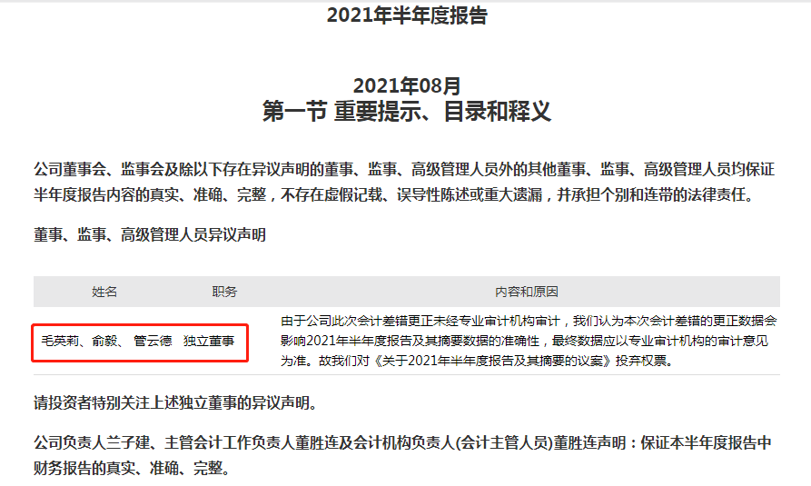 8月20日晚间,星星科技发布了公司2021年半年报。毛英莉、俞毅、管云德三位独立董事对半年报提出异议声明。原因是,公司对前期会计差错进行更正,由于公司此次会计差错更正未经专业审计机构审计,三位独董认为,本次会计差错的更正数据会影响2021年半年度报告及其摘要数据的准确性,最终数据应以专业审计机构的审计意见为准。故对《关于2021年半年度报告及其摘要的议案》投弃权票。