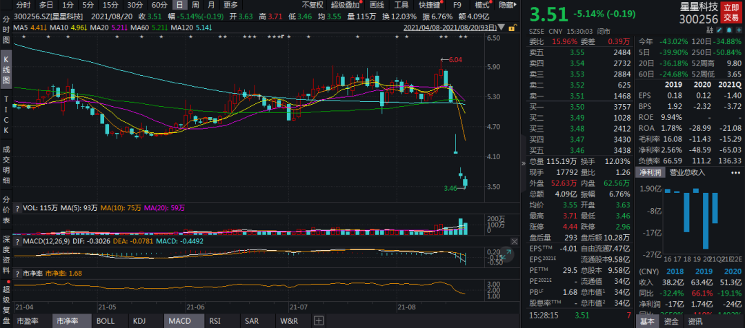从二级市场表现看,Wind数据显示,近期,星星科技股价连日大幅下挫,周跌幅达到39.9%。截至8月20日收盘,公司股价报3.51元/股,收跌5.14%。