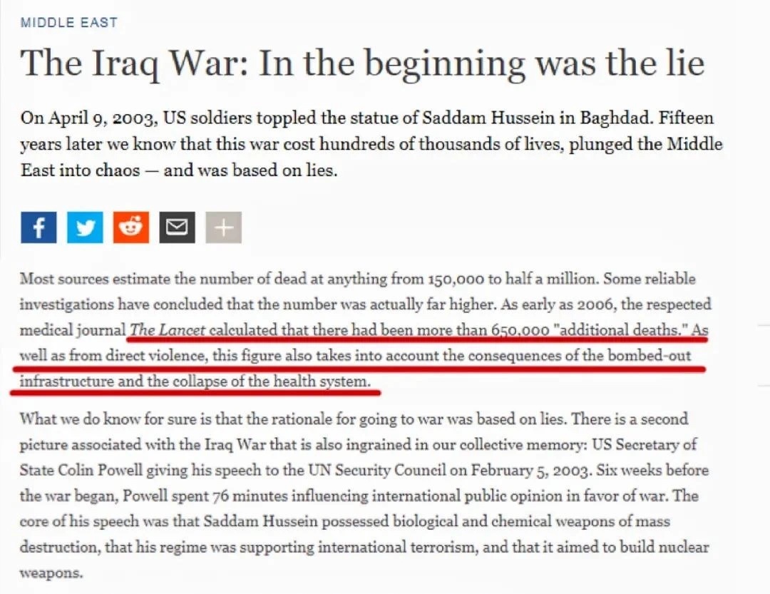 △德国之声文章《伊拉克战争从一开始就是个谎言》:国际权威医学杂志《柳叶刀》2006年估计,有超过65万伊拉克人在战争中“额外死亡”。