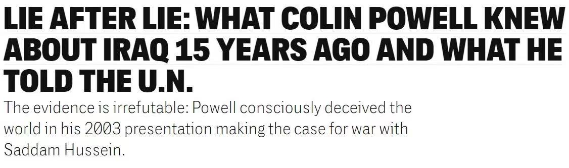 △美国新闻调查网站“拦截”文章《谎话连篇》:无可辩驳的证据是,鲍威尔在2003年有意识地欺骗了世界。从来没有人要求他为自己的行为负责,而且他永远也不太可能被追究责任。