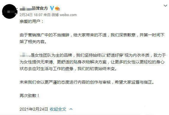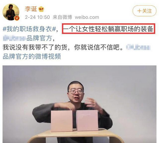 2021年2月24日10时50分李诞在其个人微博发布一条某品牌女性内衣广告。广告中含有“#我的职场救生衣#,一个让女性轻松躺赢职场的装备”等文字内容和一段李诞推介某品牌内衣的视频广告。广告内容遭到众多网友的反对和抨击。