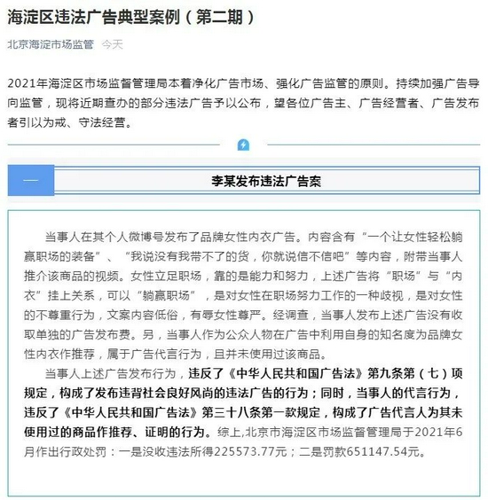 据中国市场监管报记者了解,“李某发布违法广告案”中李某即为知名脱口秀演员李诞。北京市海淀区市场监督管理局对其个人微博号发布某品牌女性内衣违法广告一案于2021年6月作出没收违法所得225573.77元、罚款651147.54元,共计876721.31元的行政处罚。