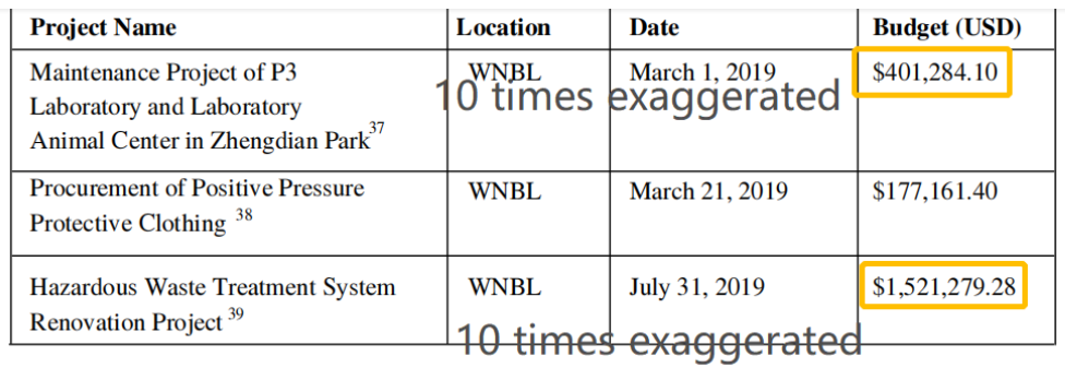 为什么这么说呢?从最先发现这个问题的新华社记者王子辰的分析来看,美方这份报告中其实存在问题的数据,远不止安保和中央空调系统两处。报告中提及的武汉病毒所P3动物实验室及实验动物中心的维保项目、园区危废处理系统改造工程、以及环境空气消毒处理系统和可拓展型自动化样品存储管理系统采购项目的项目金额,也与中文原文的金额差出了10倍乃至100倍。