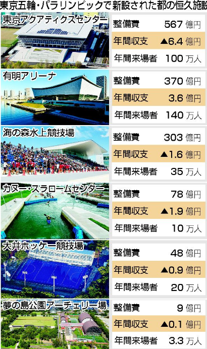 据时事通讯社报道,6个场馆中“东京游泳中心”建造耗资最多,达567亿日元,拥有世界最高水准的游泳设备,在进行修整之后将于2023年重新开放,预计每年举办约100场比赛,观众人数目标定为100万人次。尽管如此,因为维护费用高昂,时事通讯社称,预估“东京游泳中心”在今后每年将带来约6.4亿日元的赤字。
