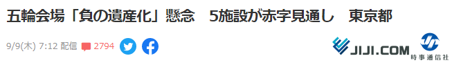 时事通讯社称,为了举办东京奥运会,东京都建造了6个永久保留的场馆,共花费约1400亿日元。此外,其中5个场馆在今后的运营中将很难达到收支平衡,预估每年将带来约11亿日元的负收益。