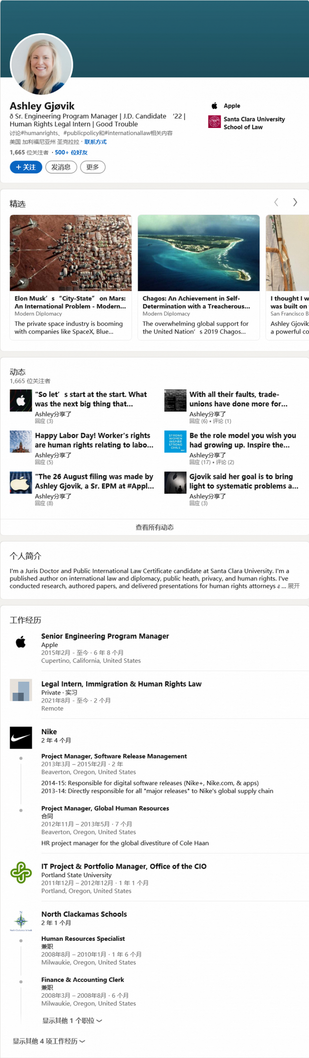 因涉嫌违反公司规定泄露机密信息,苹果解雇了高级工程项目经理 Ashley Gjøvik。在过去几个月里,Gjøvik 一直在 Twitter 上公开发表关于骚扰、监视和工作场所安全的指控。