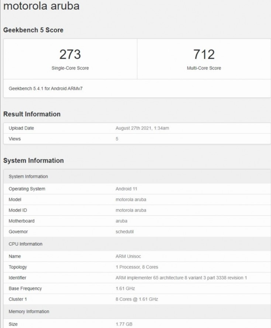 摩托罗拉 Moto E30 的芯片比 Moto E20 的 T606 芯片要强一些,8 核 1.82GHz,Geekbench 5 单核跑分 305,多核跑分 762,目前不知是哪个型号。