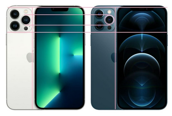 相比起来,iPhone 13 Pro 系列的模组设计要没那么明显:乍一看好像没什么变化,仔细看会发现无论是镜头大小还是三摄模组都比前代要大上一圈,模组整体几乎占据了手机宽度的一半。