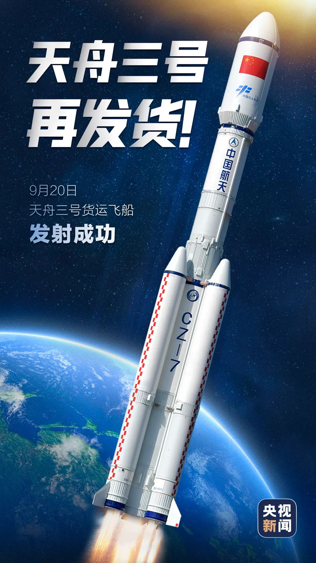据中国载人航天工程办公室消息,北京时间9月20日15时10分,搭载天舟三号货运飞船的长征七号遥四运载火箭,在我国文昌航天发射场点火发射,约597秒后飞船与火箭成功分离,进入预定轨道。15时22分,飞船太阳能帆板顺利展开且工作正常,发射取得圆满成功。后续,天舟三号货运飞船将与在轨运行的空间站组合体进行交会对接。