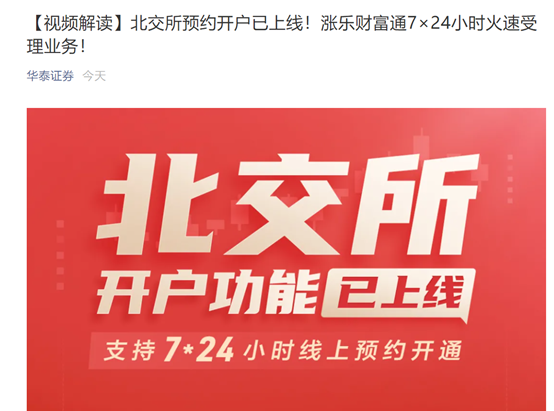 20日午间,华泰证券官宣北交所预约开户功能已上线,涨乐财富通7×24小时火速受理业务,公司还以投教小视频的方式,对北交所成立释放的信号、投资者如何参与投资进行一一解读。