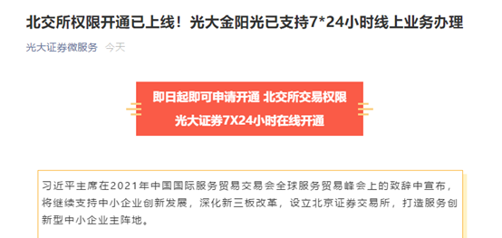 光大证券北交所权限开通业务也于20日上线,光大金阳光APP已支持7x24小时线上业务办理。