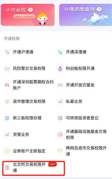 方正证券小方APP业务办理相关页面也显示,已上线北交所交易权限开通功能。