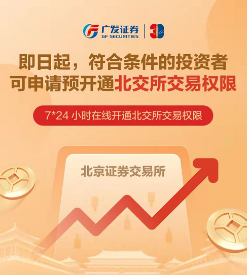 19日,广发证券“广发易淘金”APP推送了开通北交所权限预约通知,公司表示7x24小时在线受理北交所投资者预约开户申请。