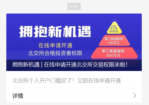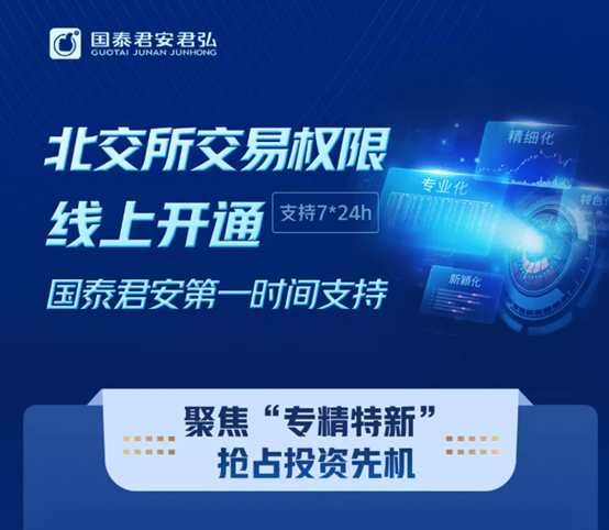 “国泰君安君弘”公众号发布推送,称已“第一时间支持北交所交易权限开通”,即日起符合条件的投资者可在君弘APP、富易开通交易权限,支持7x24小时在线开通。