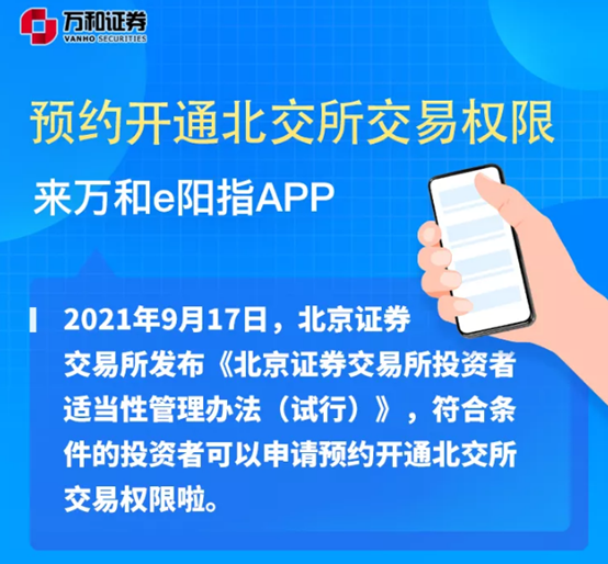20日,万和证券宣布,万和e阳指APP上线了北交所交易权限预约开通功能。