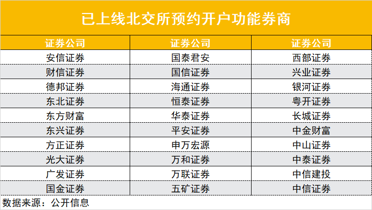 消息一出,随即按下券商备战北交所的展业“快进键”,尽管适逢中秋假期前夕,不少券商火速推出北交所预约开户功能,截至发稿至少已有30家券商宣布支持北交所预约开户。