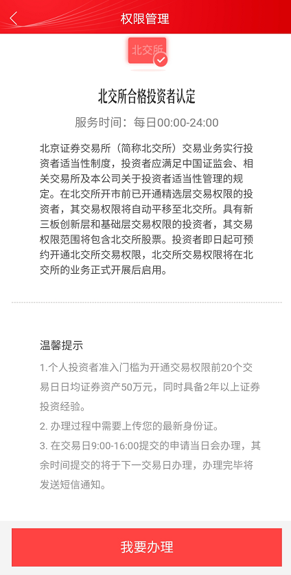 中信证券开通了北交所合格投资者认定板块,并支持7x24小时办理开户。