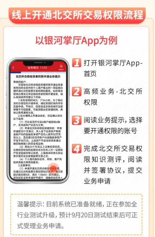 五矿证券在线预约开通北交所交易权限已开启,五矿手机证券APP可7x24小时在线受理。