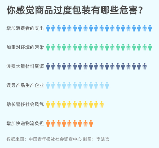调查中,70.1%的受访者感觉过度包装增加了消费者的支出,68.4%的受访者认为加重了对环境的污染,65.5%的受访者感觉浪费了大量材料资源。