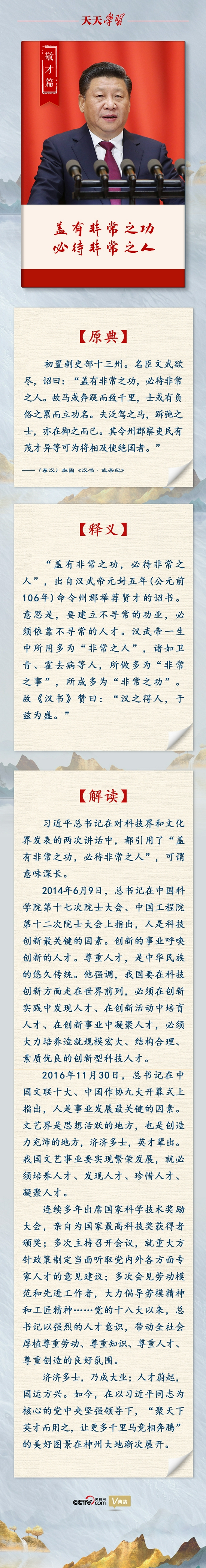 编者按:中央人才工作会议9月27日至28日在北京召开,习近平总书记出席会议并发表重要讲话。党的十八大以来,总书记站在党和国家事业发展全局的战略高度,对我国人才事业发展作出一系列重要指示。在讲话和文章中,他大量引用有关中国古代人才思想的典故,就如何选才、敬才、求才、育才、用才等话题,提出了一系列新思想、新观点、新论断、新要求,为新时代做好人才工作提供了根本遵循和行动指南。《天天学习》带您一起学习回顾。