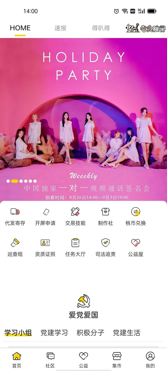 如今桃叭App的页面。海外偶像视频见面会是它重视的业务,此外它还增加了党建学习版块。