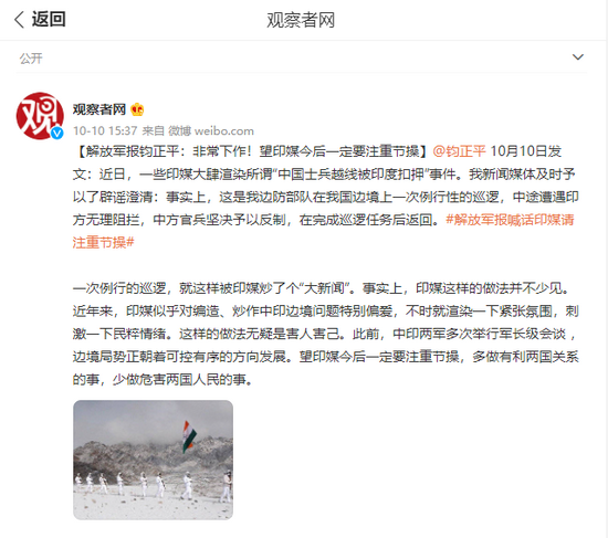 @钧正平 10月10日发文:近日,一些印媒大肆渲染所谓“中国士兵越线被印度扣押”事件。我新闻媒体及时予以了辟谣澄清:事实上,这是我边防部队在我国边境上一次例行性的巡逻,中途遭遇印方无理阻拦,中方官兵坚决予以反制,在完成巡逻任务后返回。