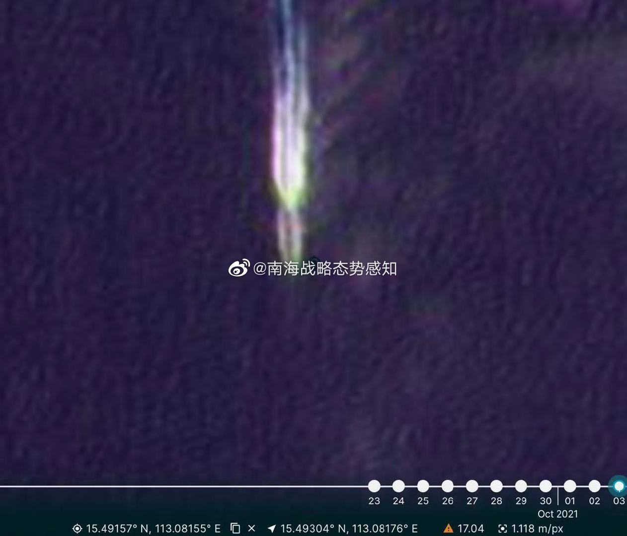 保密的潜艇部队熬到10月7日才通报事故情况,主要是因为秘密保不住了。在事故发生以后,美国潜艇无法继续保持下潜,只能上浮暴露在侦察平台面前。根据@南海战略态势感知发布的消息,10月3日,商业卫星Planet卫星就在西沙群岛东南约48.7海里处发现一艘疑似“海狼”级潜艇,上浮至航行状态。由此推测,美军潜艇发生事故位置极有可能在西沙附近海域。