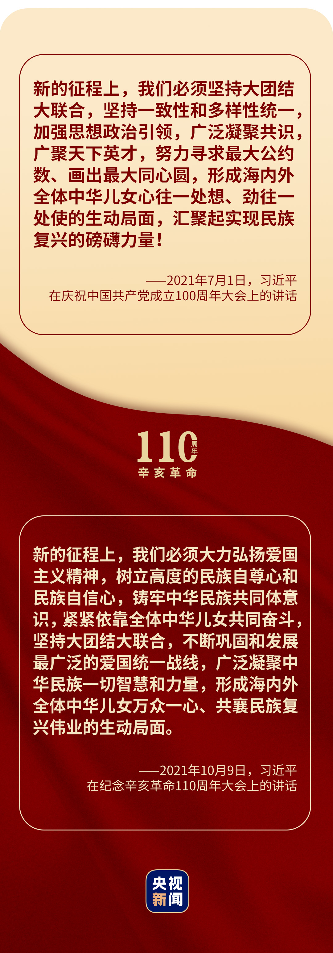 回望辛亥革命110年来的历史,我们要更加紧密地团结起来,发扬孙中山先生等辛亥革命先驱的伟大精神,携手向着中华民族伟大复兴的目标继续奋勇前进!