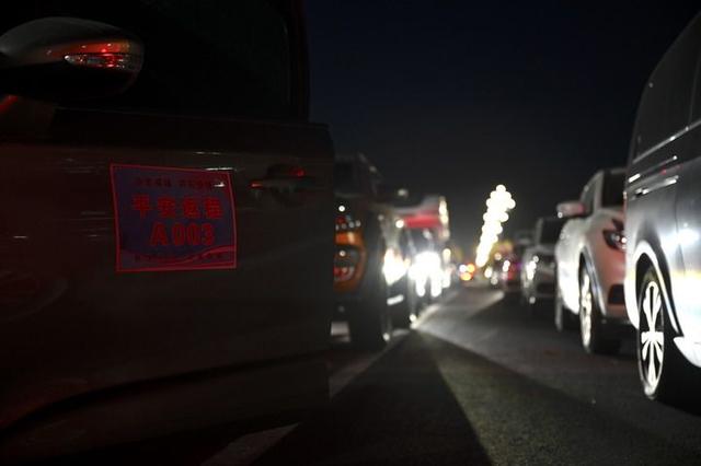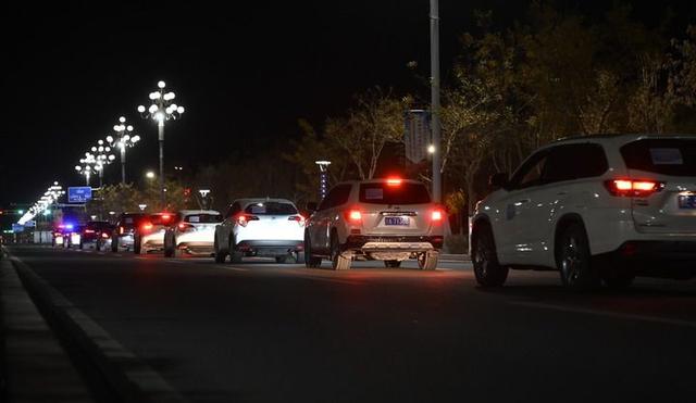 ↑10月28日晚拍摄的即将离开额济纳旗的滞留自驾游客车队。
