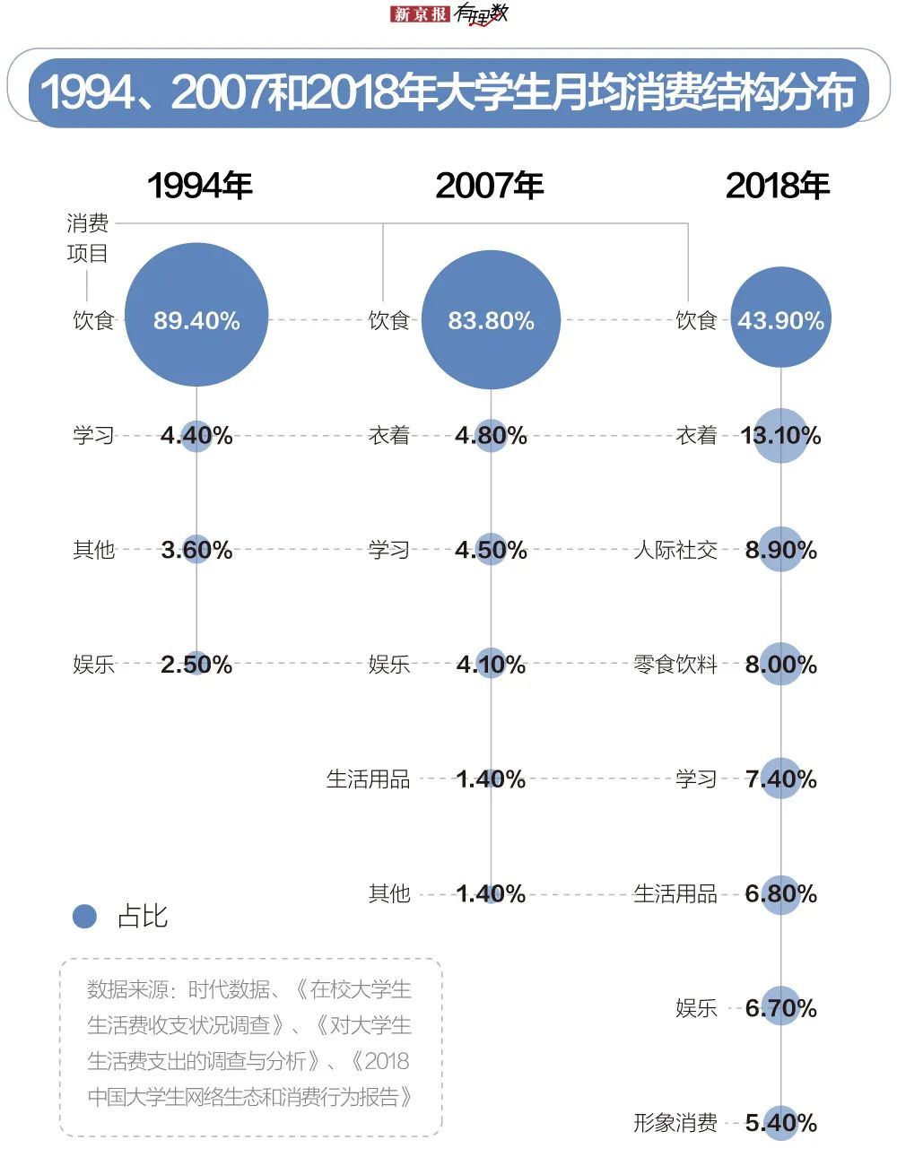 可以看出,在1994-2007年间,大学生每个月饮食消费支出仅由89.4%下滑至83.8%,但截至2018年,饮食虽然仍旧是占比最大的消费支出,但已仅占43.9%,大学生们将其余生活费用在了结构更为丰富的消费中。