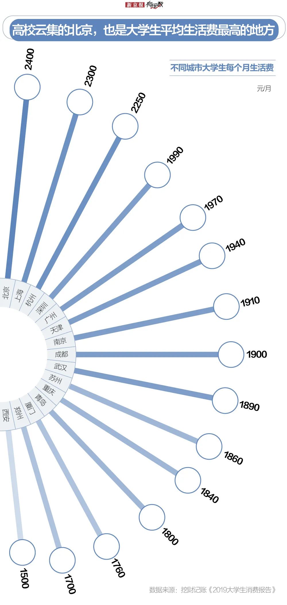 月均生活费超过2000元的城市,有北京、上海和杭州,而深圳、广州这些一线城市的大学生,月均生活费均接近2000元大关。