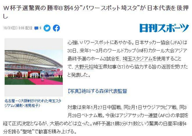 埼玉体育场始建于2001年,可容纳观众62000人,是2002年世界杯的主体育场之一。报道中表示,日本足协将使用埼玉体育场来作为明年1月-3月份进行的12强赛国家队的主场,三场比赛分别为1月27日对阵中国队、2月1日对阵沙特队以及3月29日对阵越南队。