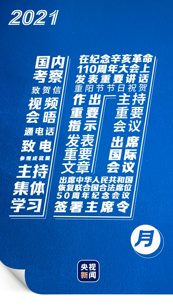 在纪念辛亥革命110周年大会上,高度评价辛亥革命的历史功勋,呼吁海内外全体中华儿女携手向着民族复兴的目标继续奋勇前进;来到黄河入海口,部署推进黄河流域生态保护和高质量发展的国家战略;参观国家“十三五”科技创新成就展 ,对广大科技工作者提出殷切期盼;开展多次“云外交”,阐明中国主张……习近平高瞻远瞩,话语铿锵。