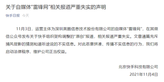 11月3日,运营主体为深圳英鹏信息技术股份有限公司的自媒体“雷锋网”,在其微信公众号发布关于快手组织架构调整的“原创”报道,相关报道严重失实。文章通篇充斥捕风捉影的猜测和道听途说的不实信息。对此恶意拼凑、传播不实信息的行为,我们将启动法律程序,维护公司正当权益。