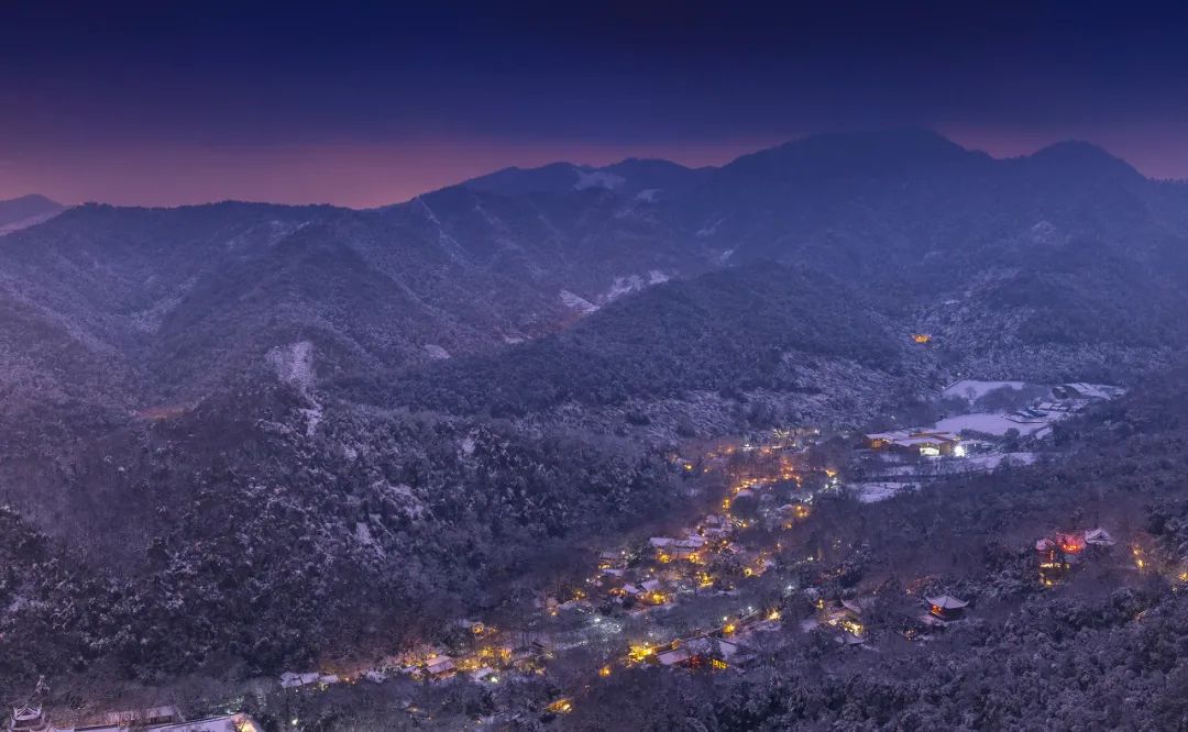 漆黑的夜晚,万籁俱寂的时空中,站立于高处,低头看着灵隐寺下点点星火,外面黑蒙蒙的混沌中白星簌簌。