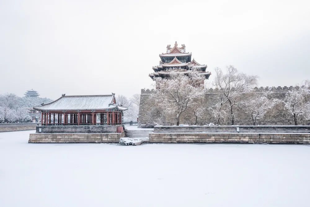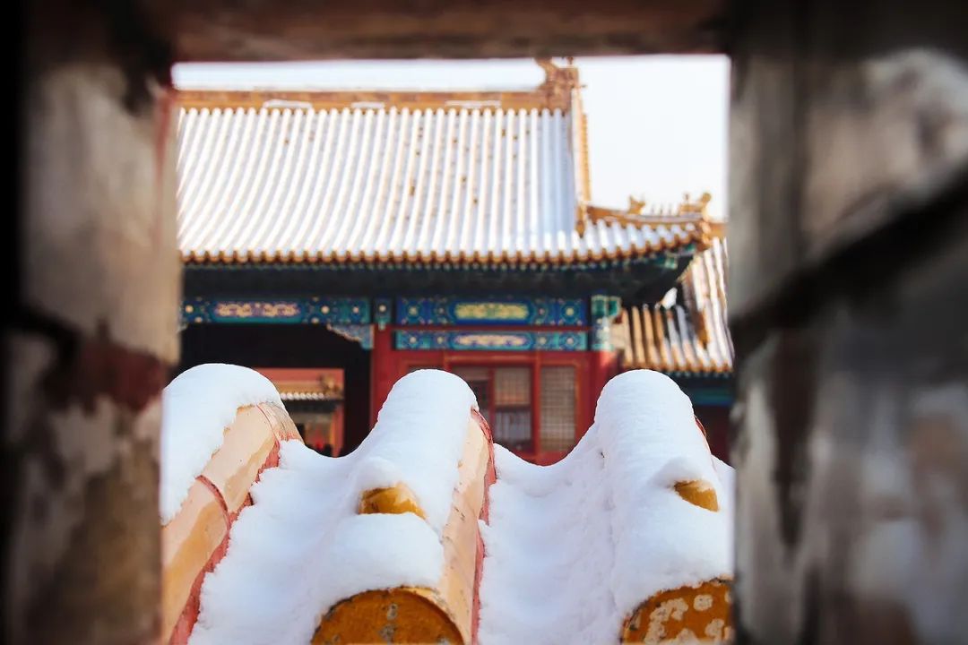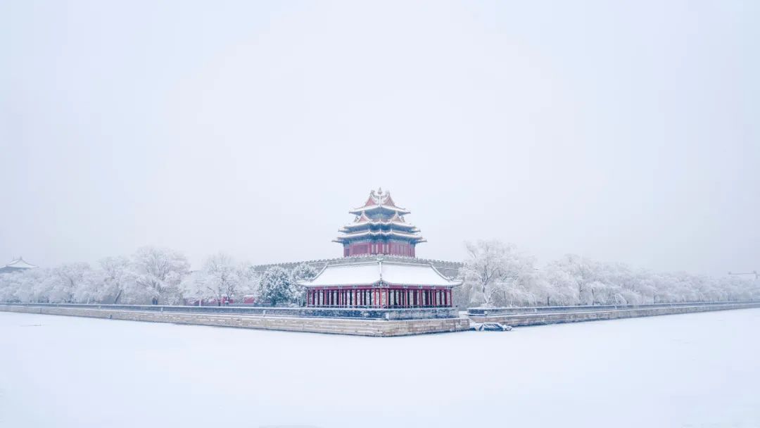 白雪勾勒出每一座宫殿的轮廓,覆盖着深宫琉璃瓦的屋檐。