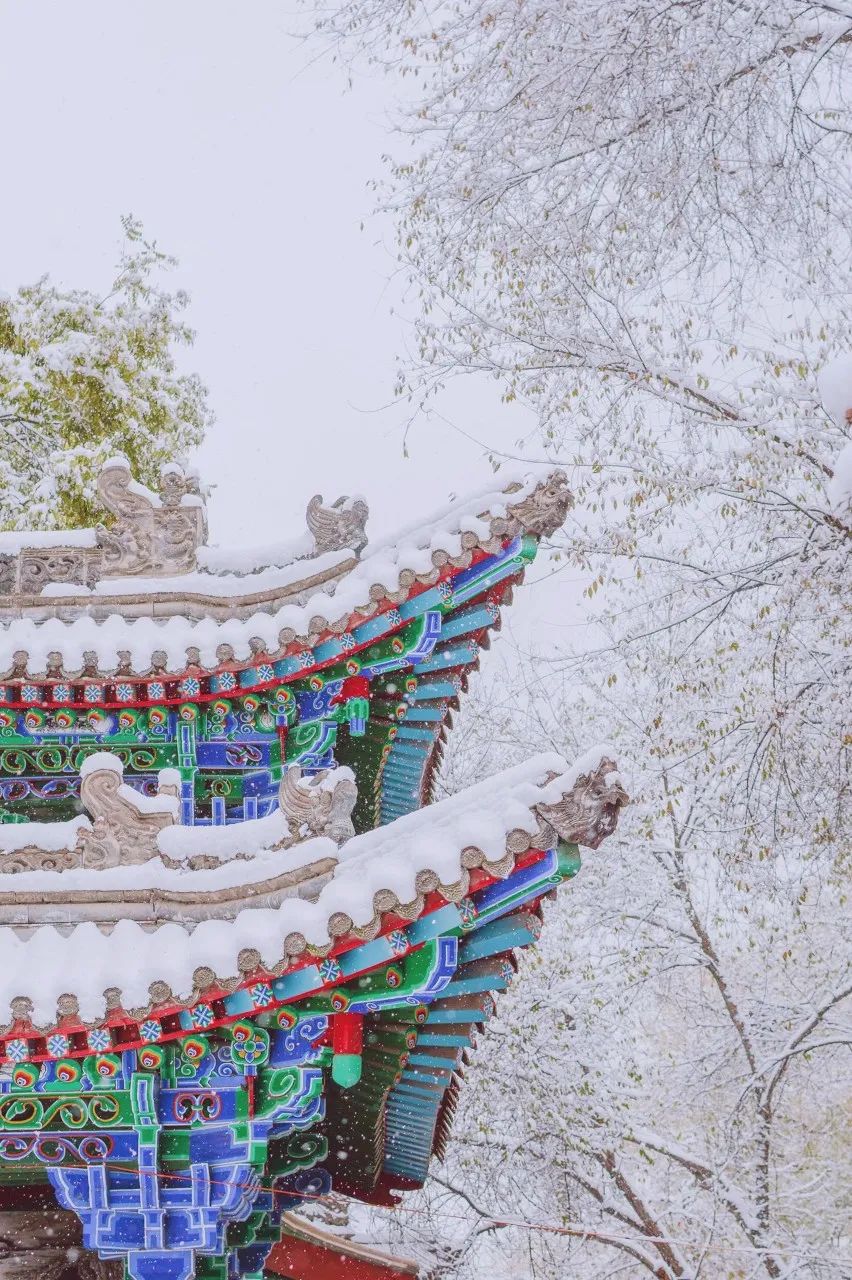 抬头看那高高翘起的檐角乘着白雪,房顶上的瑞兽披着白雪仿佛瞬间腾跃。