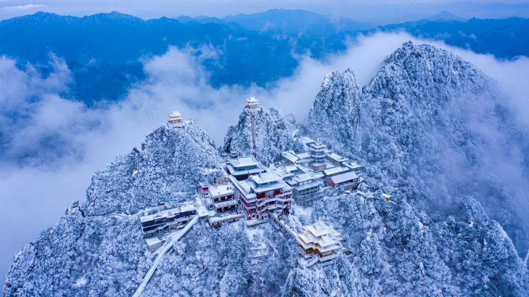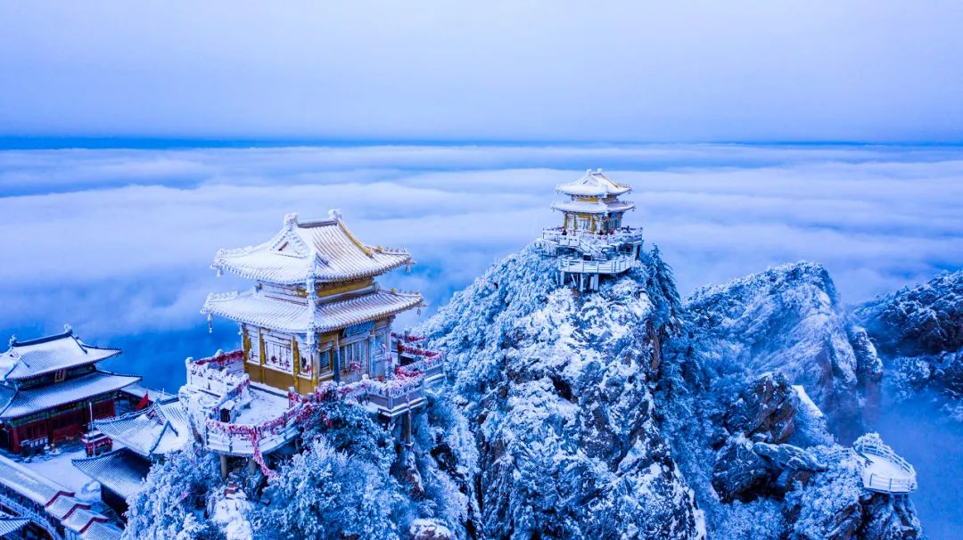 冬雪与松、石、云巧妙结合,配以晶莹冰挂、琉璃雾凇、宏伟金殿,将老君山装扮成绝美的人间仙境。