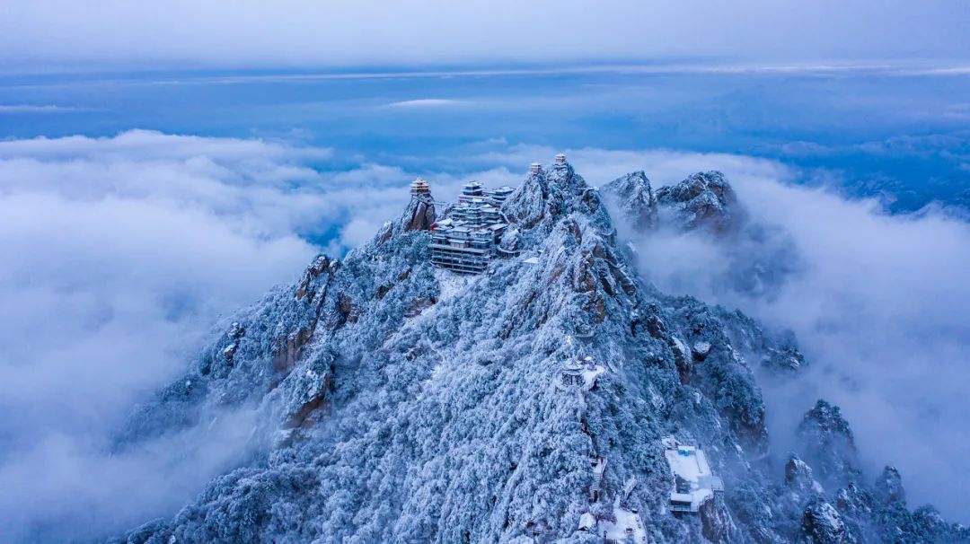一场雪伴随着氤氲的云雾缭绕在老君山上,站在山巅会忍不住吟唱“不知天上宫阙,今夕是何年”。
