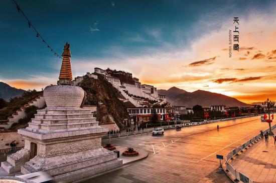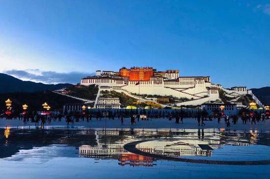 傍晚,当你在窗台遥望着布达拉宫,看着它在蓝丝绒般天色中逐渐亮起灯光时,