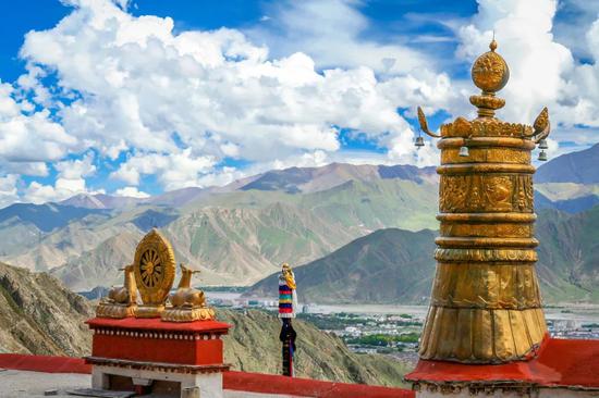 甘丹寺位于拉萨市达孜区的旺波日山上,旺波日山犹如一头卧伏的巨象,驮载着布满山坳、规模庞大的建筑群。
