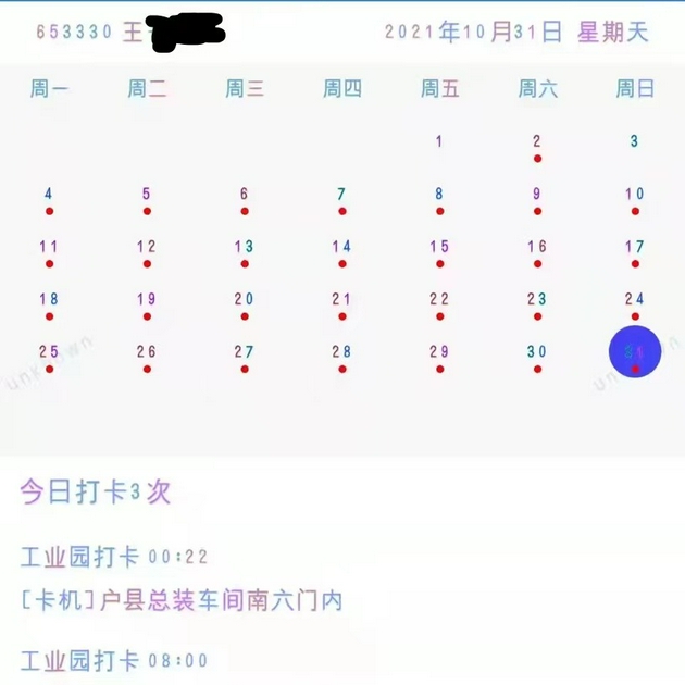 打卡记录显示,王江龙(化名)在十月份只有1号和3号没有打卡记录。