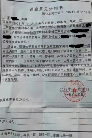 11月5日,36岁的王江龙(化名)被发现猝死在出租屋中,警方出具的调查意见告知书显示,已排除刑事案件。王江龙的家属向澎湃新闻表示,他们认为王江龙的意外去世,和其生前曾连续超时高强度工作有关联。但因未做尸检,王江龙的具体死因目前尚不明朗。
