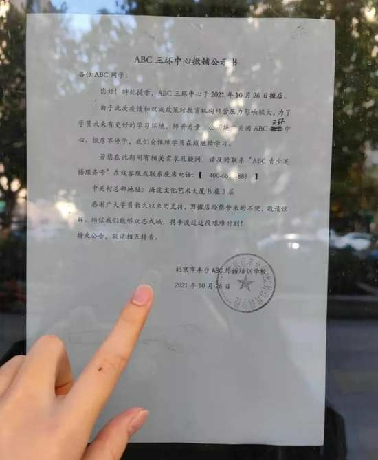门上还张贴着“撤铺公示书”,其中提到,该门店于10月26日撤店,“为了学员未来有更好的学习环境、师资力量,公司决定关闭ABC三环中心。撤店不停学,我们会保障学员在线继续学习”。
