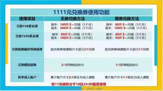 前几天,51Talk的工作人员又给沈女士发来3张1111元的兑换课券,除了包含平台购物置换之外,还能兑换1对8、1对50的素养课、核桃编程等商城课,也可以转化为成人课程。
